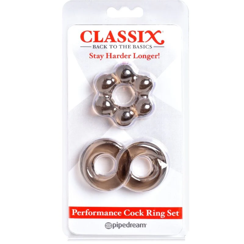 ¡Aumenta la intimidad y el placer con el set de 2 anillos para pene CLASSIX gris!