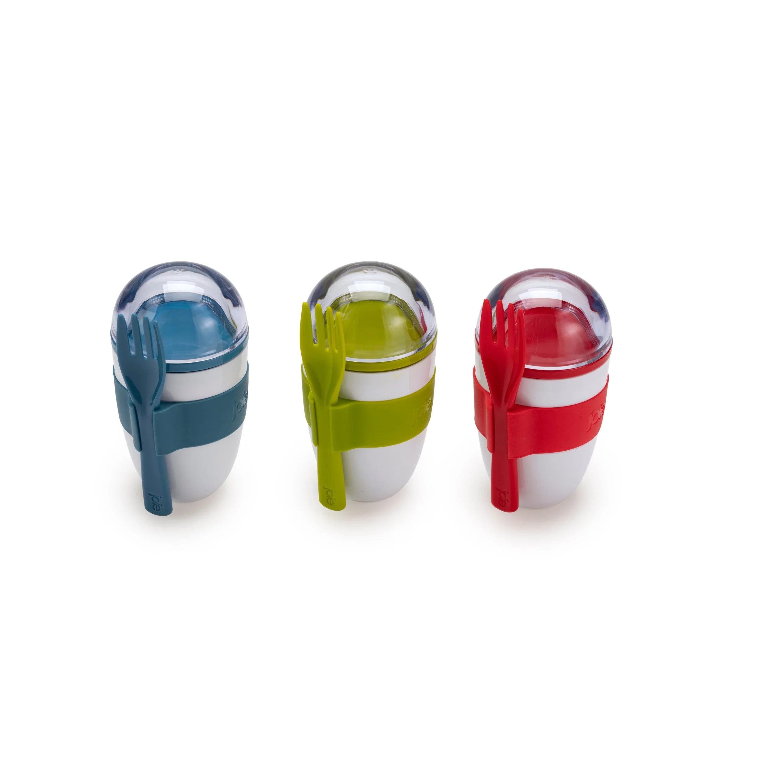 El diseño inteligente del contenedor incluye secciones separadas para mantener tus ingredientes frescos y crujientes, además de un compartimento especial para el aderezo, evitando que se empape la ensalada. ¡Incluye un tenedor reutilizable para que puedas disfrutar de tu comida de inmediato!