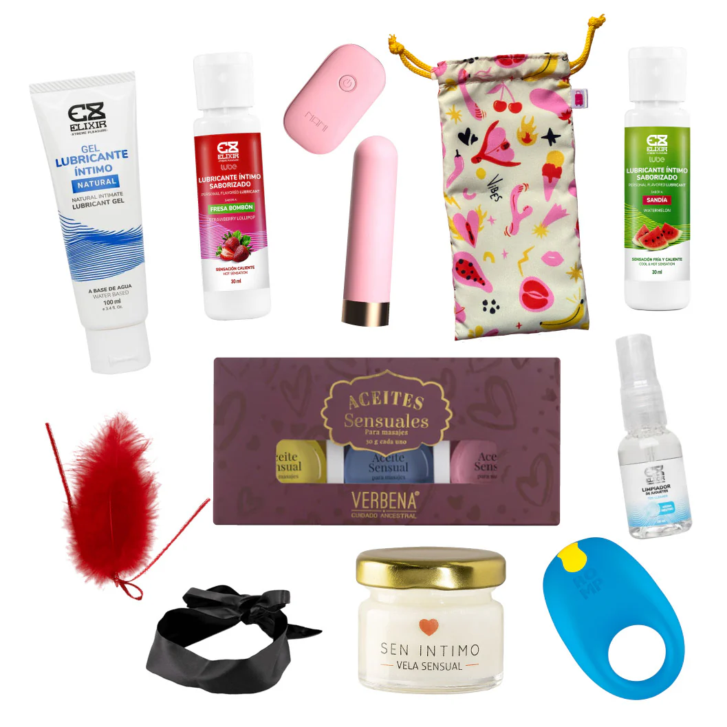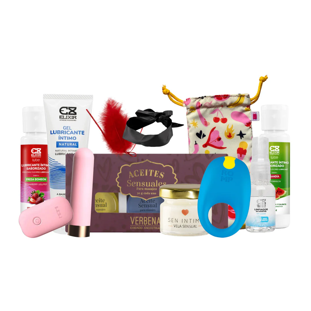 Dentro de este tesoro, encontrarás una selección de juguetes vibrantes y accesorios diseñados para despertar la sensualidad. Incluye una balita vibradora con control remoto, un anillo vibrador, lubricantes neutros, con sabor y temperatura, un kit sensorial, aceites para masajes y una vela para masajes. Cada elemento ha sido cuidadosamente elegido para ofrecerte una experiencia inolvidable.
